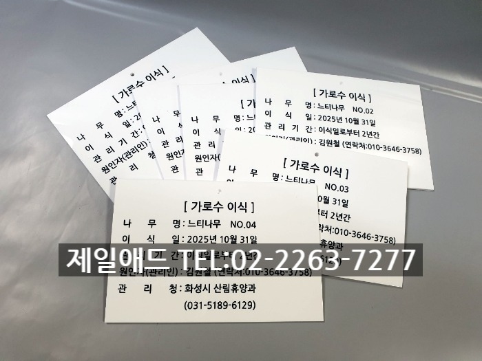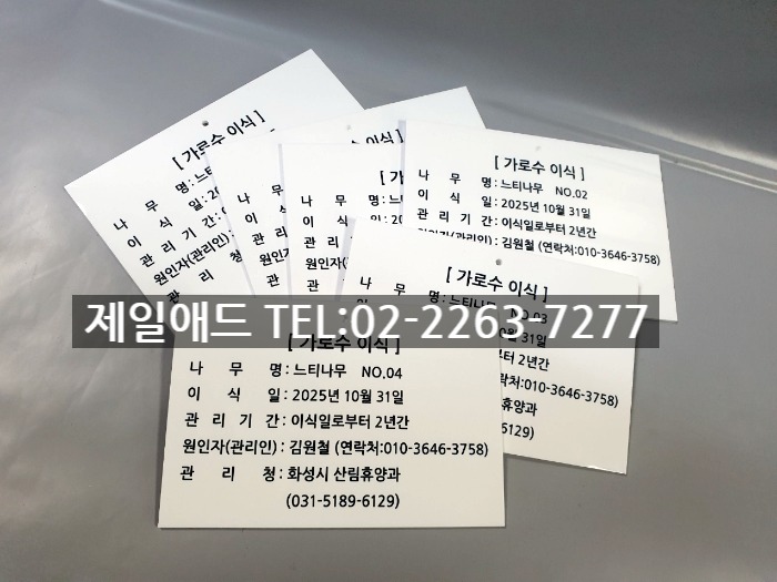 120 실명제표지판-실명제표지판 가로수 이식 신규 실명제 표찰 나무명 이식일 관리기간 관리인 관리청 실명제현판 아크릴 명판 스텐 안내판 제일애드 02-2263-7277