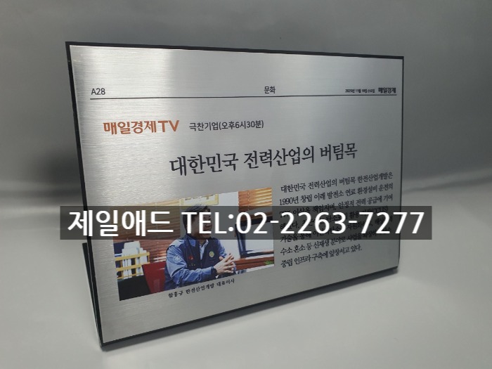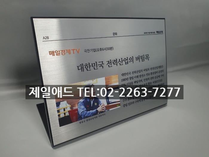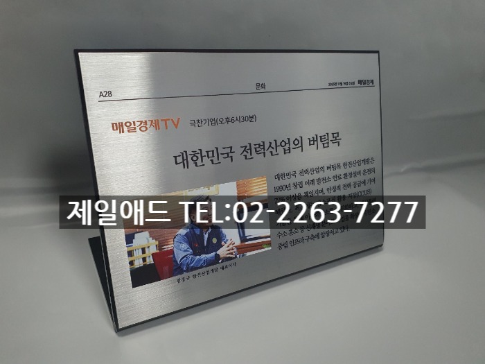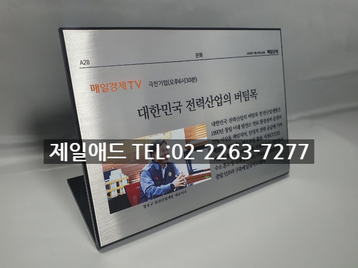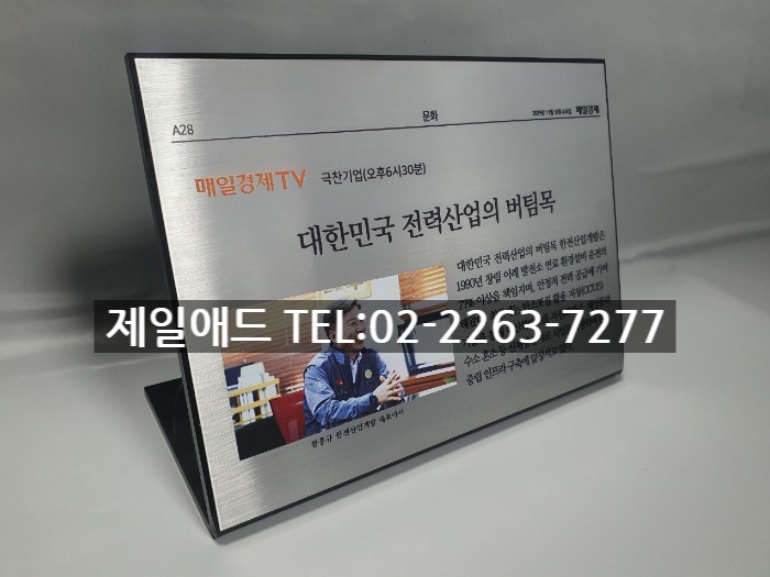han-신문 기사 전시현판 설명명판 브렌드 표지판 브랜드 전시용 표찰 전시품 설명표시판 금속 스텐드 알림판 제품 안내판 제일애드 02-2263-7277