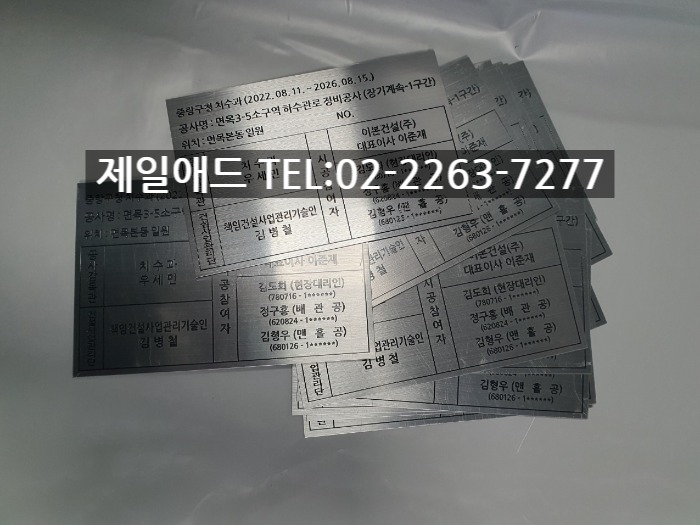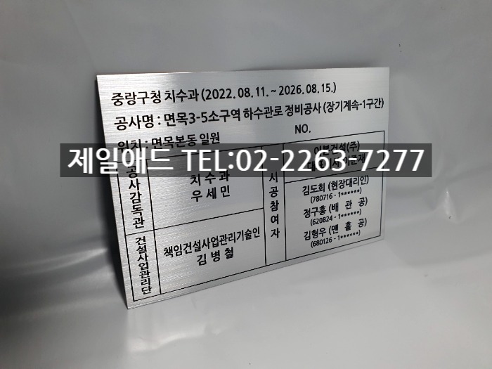 131 실명제표지판-공사 준공 표지판 하수관로 정비공사 실명제 표찰 공사감독관 건설사업관리단 시공사 시공참여자 실명제 현판 스텐 명판 금속 알미늄 안내판 제일애드